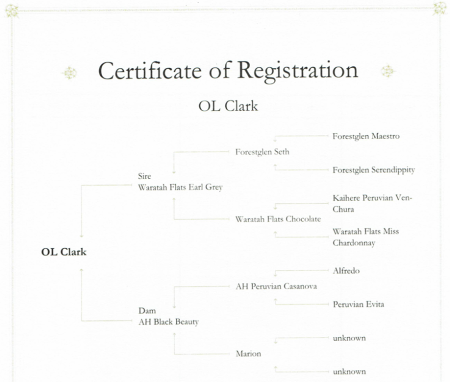 Sein Vater, Waratah Flats Earl Grey, war im Showring ebenfalls überaus erfolgreich. Gleich 7 Grand Champion- Titel belegen seine Klasse. Zudem gewann Earl Grey bereits mehrfach die Nachwuchsklassen bei großen Schauveranstaltungen. Alles Zufall? Bestimmt nicht!!! Earl Grey geht selbst auf den World Fleece Champion 2008 Forestglen Seth zurück, welcher mit Earl Grey sicherlich einen seiner besten, wenn nicht den BESTEN, Nachkommen zeugen konnte. Mit Purrumbete El Dorado und Purrumbete Inti sind zwei weitere Hochkaräter der internationalen Alpakazucht in Clark´s Blut zu finden.